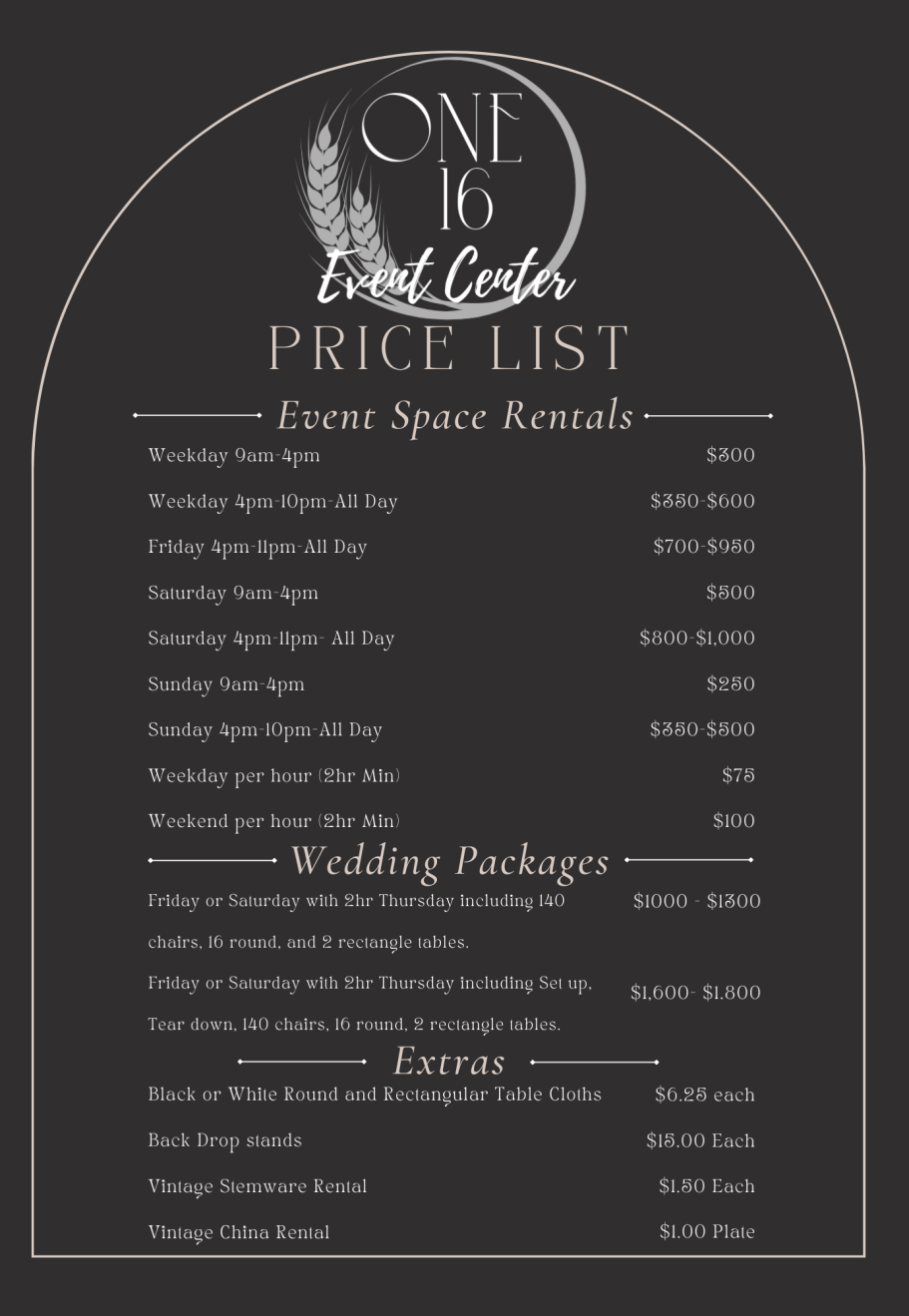 At One 16 Event Center, we create unforgettable experiences for all occasions, from weddings and birthday parties to bridal and baby showers, corporate meetings, and family get-togethers. Our grand room, featuring stunning vaulted ceilings, sets the perfect backdrop for your special celebration, allowing guests to bask in a spacious, elegant atmosphere. The facility boasts a full kitchen, ensuring that catering needs are met seamlessly, while three additional unique party and meeting rooms offer flexibility for smaller gatherings or breakout sessions. Tables, chairs, table cloths, and decorating closet are available on site. Whether you’re hosting an intimate shower or a grand wedding ceremony, One 16 Event Center provides the ideal setting to make your vision a reality.